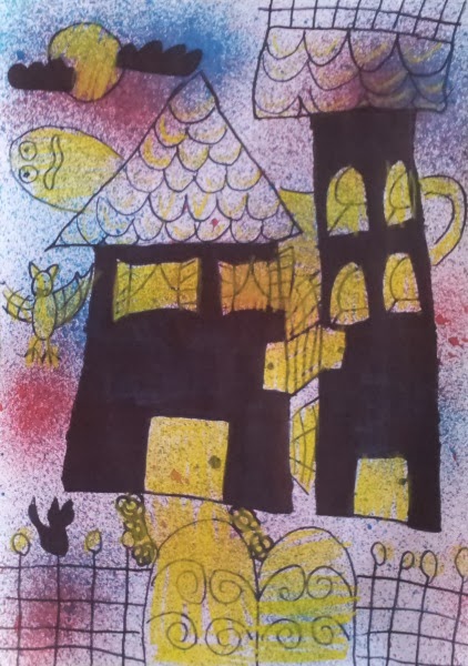 We drew our mansions with black permanent marker on paper spritzed with watercolour. We used basic shapes (squares and rectangles) for the body of the house, which many chose to bend and distort into interesting positions. Then we added different shaped roofs and other architectural features such as widow's walks, towers, differently shaped windows and roofs, doors, verandahs and chimneys.
