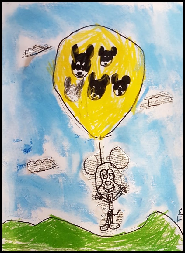 We let our imaginations take flight with elephants, giraffes, whales and many other unlikely creatures enjoying a hot-air balloon ride! Our pictures are completed using pages from an old dictionary, colour sticks and soft pastel.